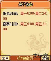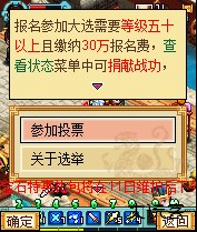 如果指定时间内选择“大选报名”便可以直接报名国公竞选,自动扣除30万报名费在“关于选举”中对参加选举报名时间和投票时间有说明。