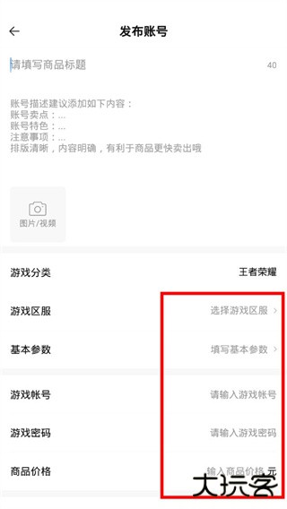 5、最后在发布商品页面中,填写基本的介绍以及游戏区服等等,进行发布即可。