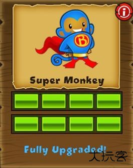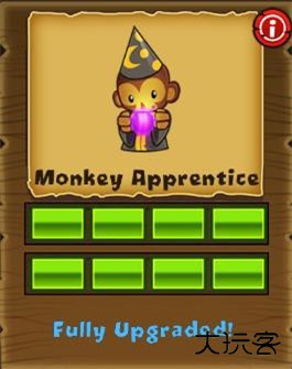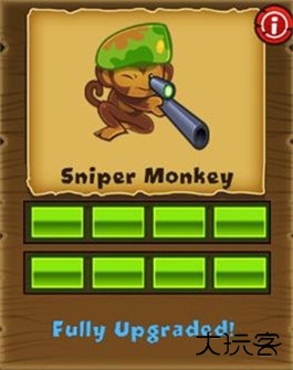 狙击手猴,全屏幕射程,射速慢,初始每穿透两层气球,建议点击后选择“strong”攻击模式。
