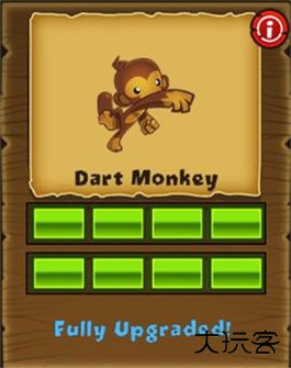 飞镖猴,即游戏封面上那只啃着香蕉的小猴,射程中等,射速普通,也是众多“射气球”游戏的主角。它的偶像是万众瞩目的“超猴”。