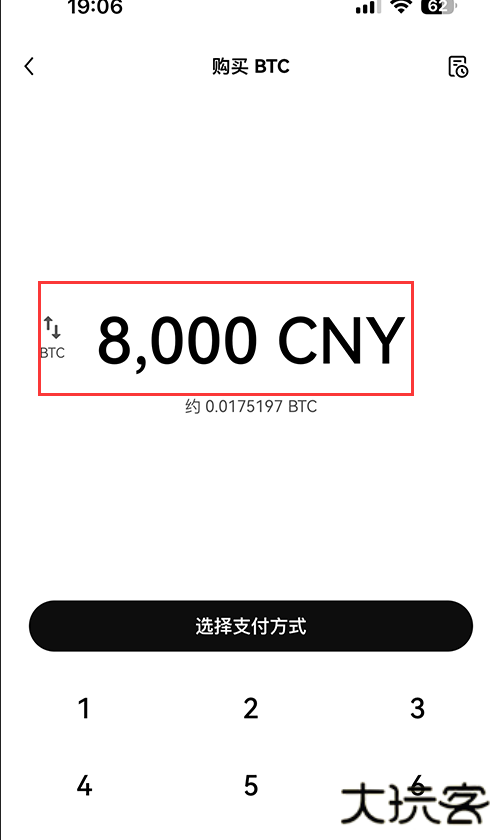 第二步:要购买的币种为BTC,输入需要购买的金额。点击如图所示的按钮即可切换成按币种数量购买。