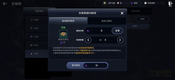 自动预约购买方式是,如果预约购买的道具登录交易所时,会从所有预约购买的冒险家中随机出售给其中—位。