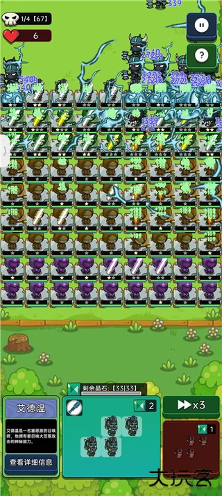 5)从从上往下摆,第2、第3排不要放二级角色,一边堆阵型一边开Buff,Buff主拿吸血,其次可选血矿速度,如果没有反伤怪的关卡就拿攻速,没得选就拿防御或者血量的Buff。