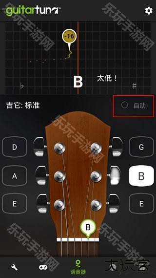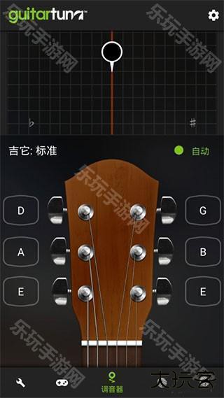 1、打开软件,默认是自动吉他调音,拨动琴弦软件会显示对应的弦和音准,不断调整使标尺位于中间并全绿通过就表示调准了