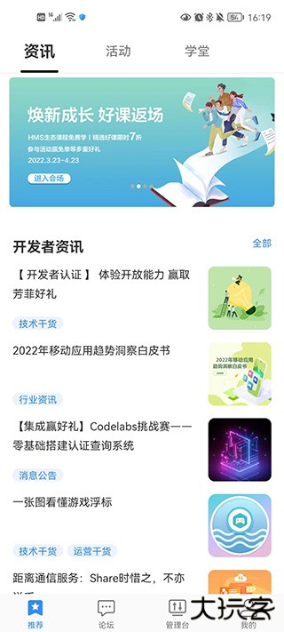 1、在软件界面首页中不仅提供了很多关于一些技术干货资讯,还提供了很多活动,并且还有学堂知识课程。