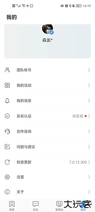 4、很多小伙伴不知道实名认证该怎么去操作,只需要点击我的,在列表中打开实名认证,选择个人或企业开发者即可。