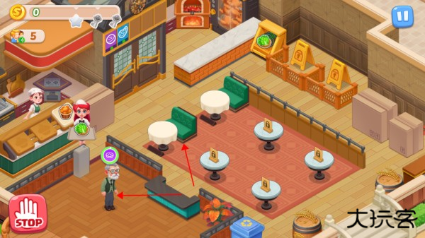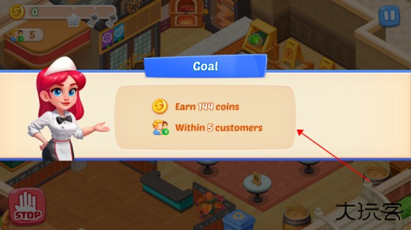 2、例如此关,需服务五位客人并获得144金币方可满星过关