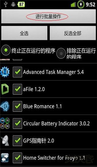 2、点击手机左下“菜单键”。便进入图二。然后再点红圈内“批处理”。