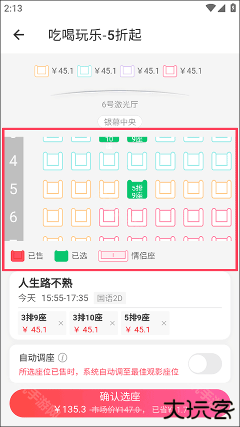 7、接下来,就可以在红色方框内的进行选座了,选完座位就可以找到并点击“确认选座”的选项进行付款了。
