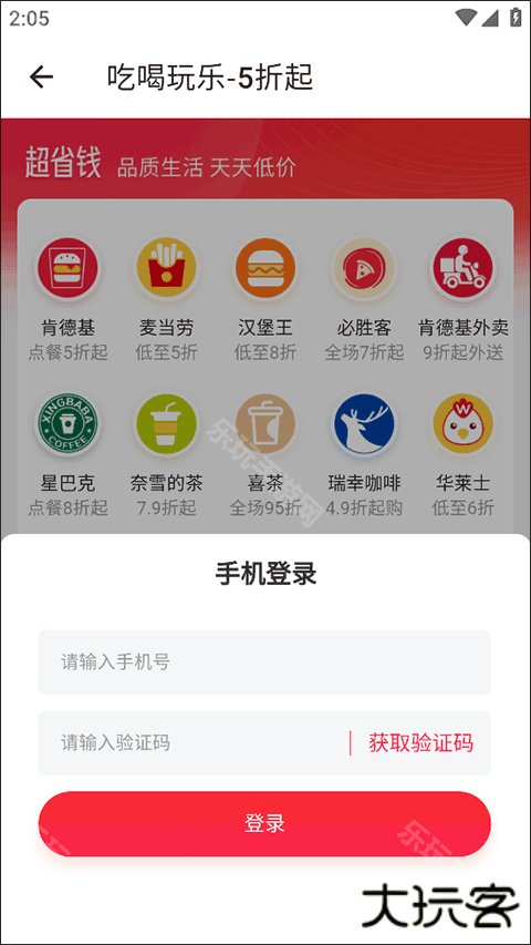 2、在“吃喝玩乐-5折起”界面输入你的手机号后,选择并点击“获取验证码”的选项;