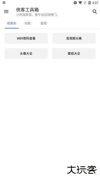 侠客工具箱是由台州拾忆网络科技有限公司推出的一款强大的工具软件,你可以在这里使用包括设备、文件、计算、图片、文字、查询等在内的超过100多种免费工具,整个软件的界面不存在任何的广告,而且涵盖的内容非常的广泛,无论是图片、黑科技还是娱乐相关的,你都可以在这里找到并且进行使用,还有实用的分类管理功能,让你可以快速的按照分类来进行需要的工具查找,非常的方便实用。