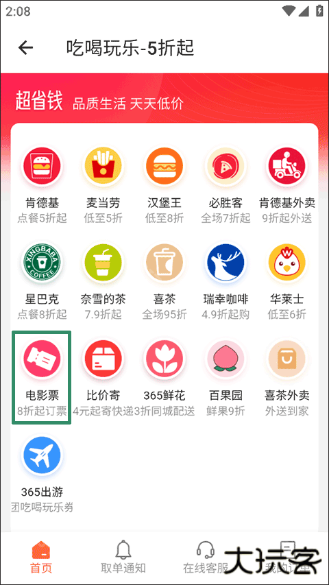 1、打开应用,在主页界面的日常工具一类中选择并点击“吃喝玩乐电影票5折”的选项;