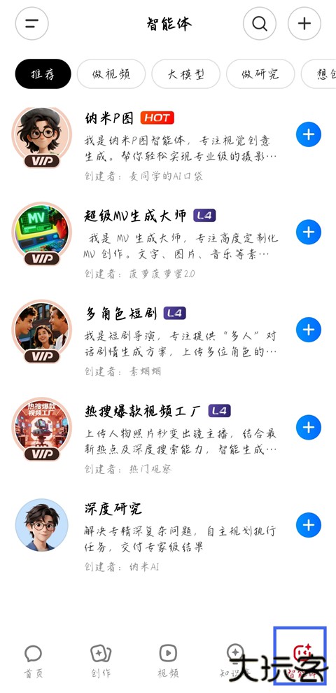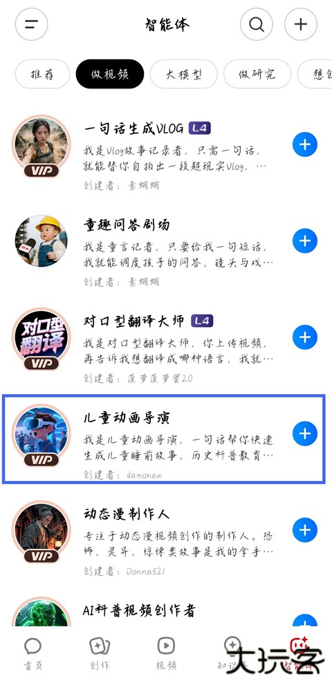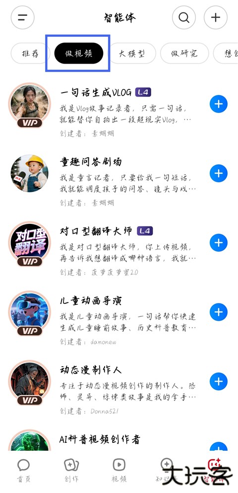 2、选择【做视频】一栏,根据视频类型在里面选择智能体。