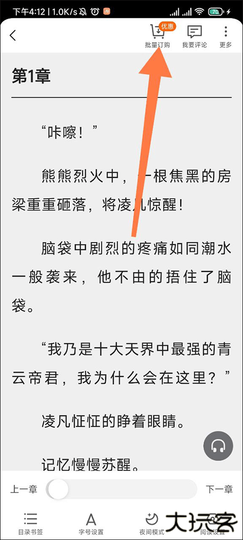3、进入阅读界面我们随机点一个地方,这个时候界面上下会弹出一些列表,跟着小编所标识的箭头看可以看见一个购物车样式的图标,这样就可以快了。