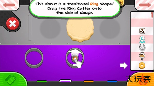 2、第一个操作间是生面团站,甜甜圈需要一个有特殊形状的生面团,玩家需要选择一个面团将其放置在工作区域。用擀面杖将其平摊成一个圆形的面饼后,借助模具来完成造型