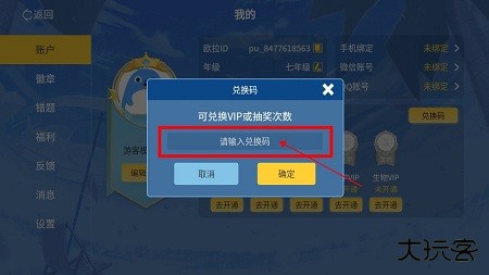 在【可兑换欧拉初中数学vip】下方输入兑换码,点击确定就能够兑换好VIP了。