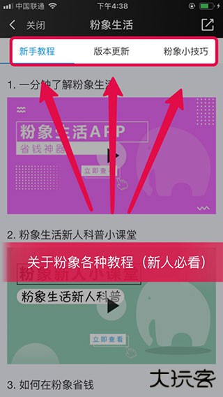 1、打开粉象生活App,然后点击我的,拉下来一点,看到一个新手教程点进去,然后你就会看到这三个标题,上面有新手教程、版本更新,以及粉象生活的小技巧。不管你是刚刚做粉象生活,还是做了很久粉象生活的,大家都要花十分钟把全部看完。