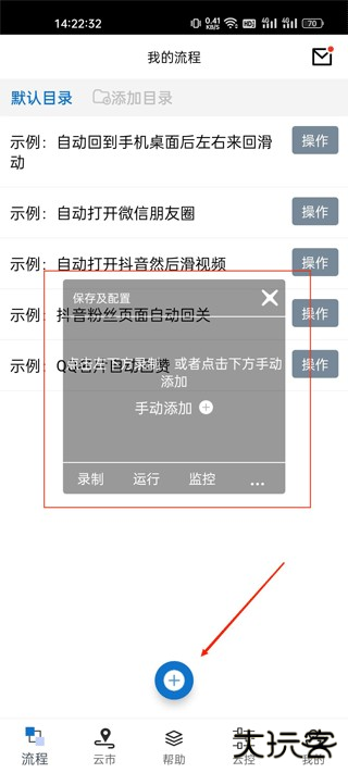 2、打开触控精灵软件,在流程界面有一个添加按钮打开,会弹出一个浮窗,我们就要在这个小浮窗上进行操作,如果没有弹出这个浮窗,就需要进行对应用的设置,根据提示将浮窗的权限打开即可
