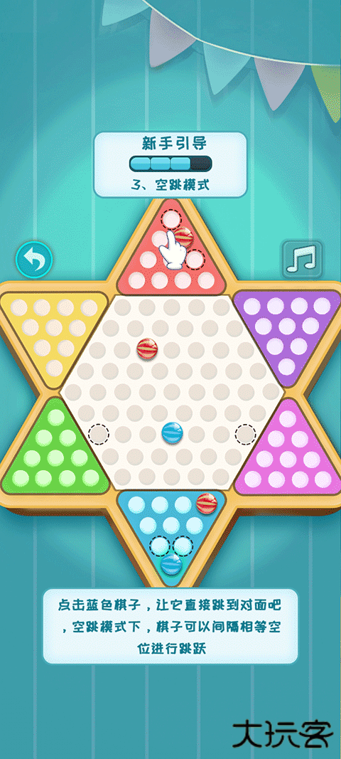 3、点击蓝色棋子,让它直接跳到对面吧,空跳模式下,棋子可以间隔相等空位进行跳跃;