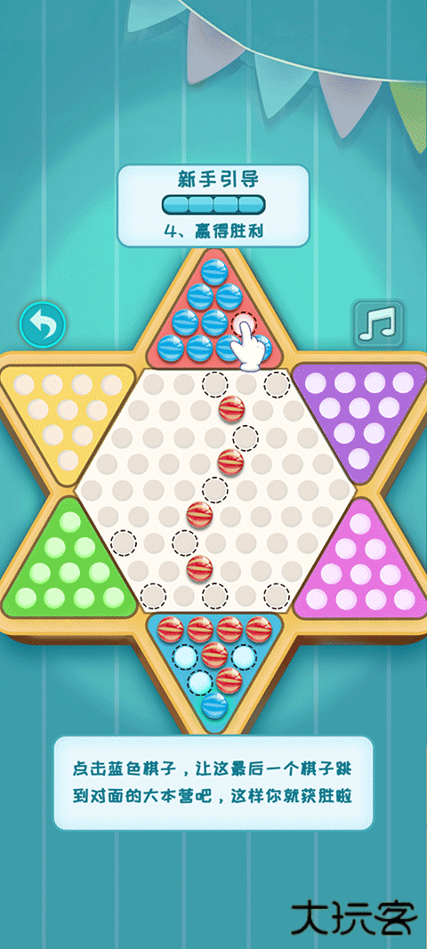 4、点击蓝色棋子,让这最后一个棋子跳到对面的大本营吧,这样你就获胜啦!