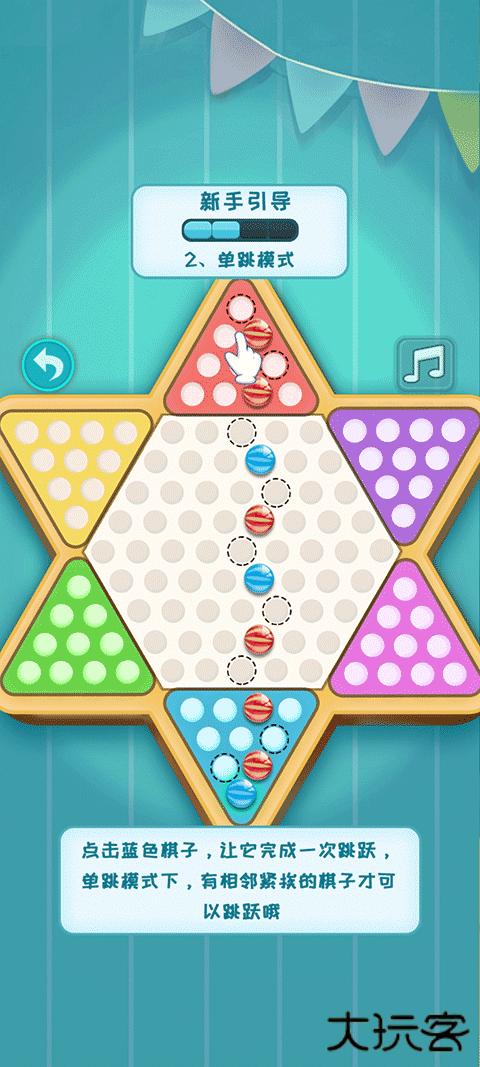 2、点击蓝色棋子,让它完成一次跳跃,单跳模式下,有相邻紧挨的棋子才可以跳跃哦!