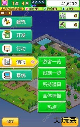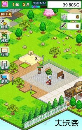 建筑设施主要分为环境建设、公共设施建设、游玩设备建设、园区环境建设,玩家通过npc给的钱进行园区布局,首先大家需要先建立广场,先让游客可以进来,然后收到一定费用时再将园区进行美化,建造一个适于人们生活的环境。后期美化包括互动性元素添加、动物园动物召唤等。