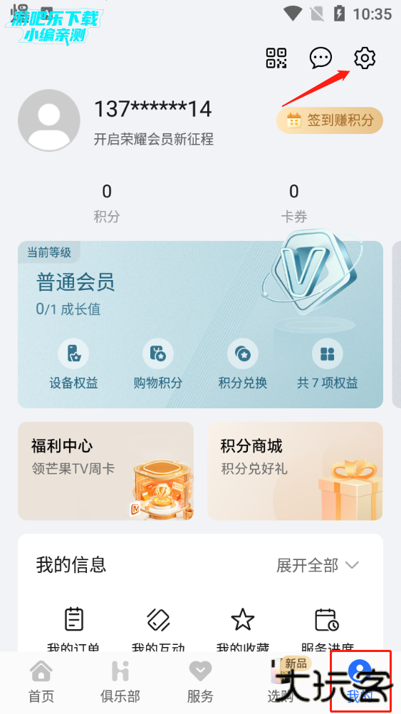 4、点击我的,可以查看设备权益、购物积分、积分兑换等权益,还可以查看订单、互动、收藏等;