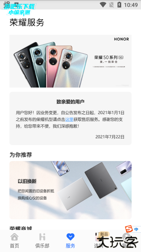 3、在【服务】,软件为用户提供了很多荣耀产品的售后服务,比如以旧换新、查询服务门店、在线客服等;