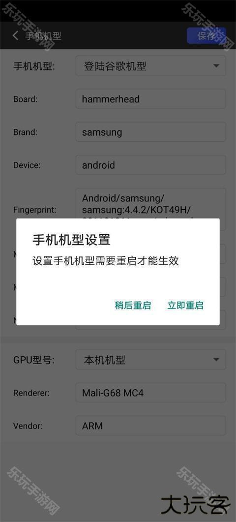 4、在手机机型中选择自己想要设置的虚拟机型,设置完成之后点击保存,然后选择立即重启。