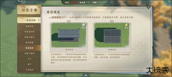 在设计时我们还可以通过调节视角来查看建筑的美观程度,在云逆水寒上有2种不同的建造视角,分别是常规视角和俯视视角,大家可以根据自己的需求来进行调整。