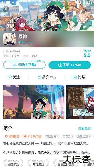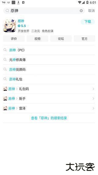 2、其次点击首页中右上方的搜索标志,输入游戏名称,如原神,该游戏的相关信息就会显示出了。