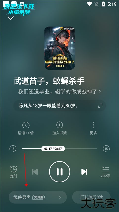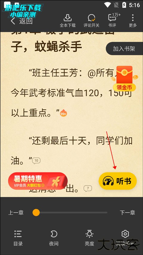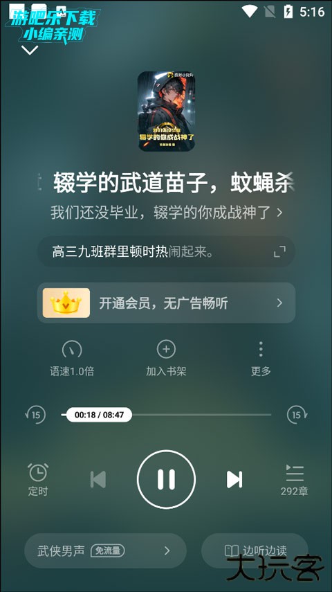 3、进入听书界面,这里可以任选一个章节听,还有给听书时间定时、调语速以及加入书架的功能
