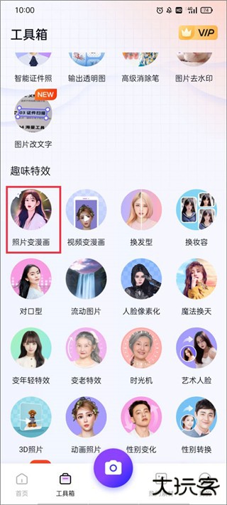 1、同样还是在【工具箱】中,向上滑动找到“趣味特效”,然后点击下方的照片变漫画。
