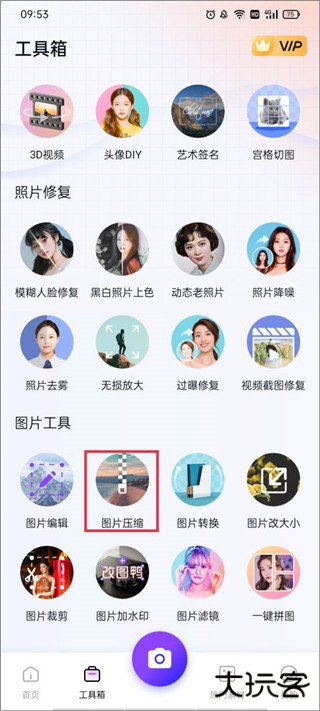 1、打开app并进入【首页】,切换到【工具箱】界面,找到图片工具中的图片压缩并点击它。