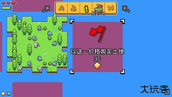 点击菜单栏中的“购买土地”按钮,可进入土地购买界面,你可以选择购买与已解锁岛屿相邻的岛屿