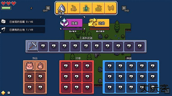 点击菜单栏中的“装备”按钮,可打开装备界面,此处将展示已经解锁的工具、武器、饰品、印章及神器