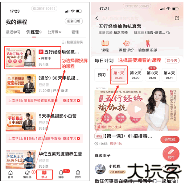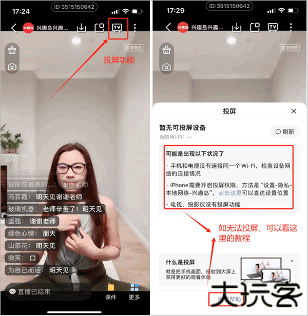 3、打开兴趣岛APP(需确保是最新版本的APP) ,选择需要投屏的课程进行投屏,具体教程如下图所示: