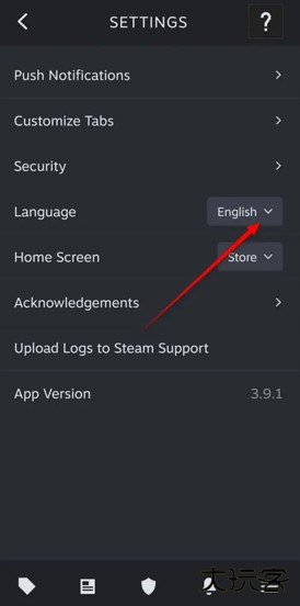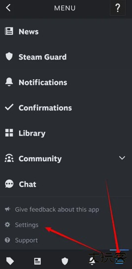 打开steam mobile,点选右下角的三横图标,点击“Settings”图标进入。