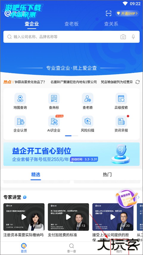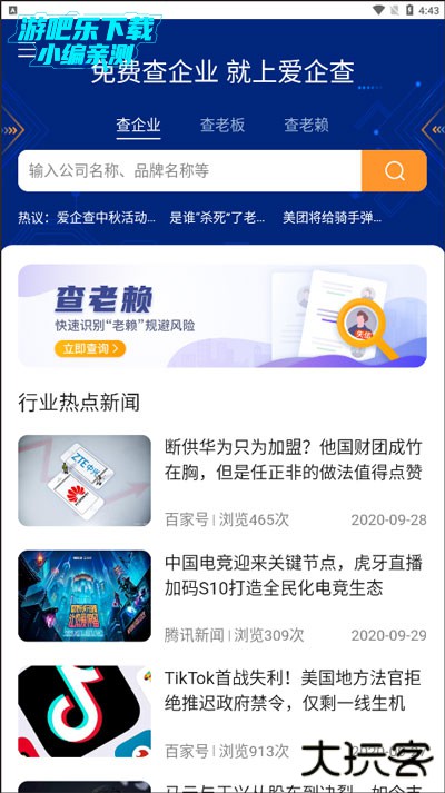 1、打开爱企查app,应用内如下图,支持查企业、查老板、查老赖: