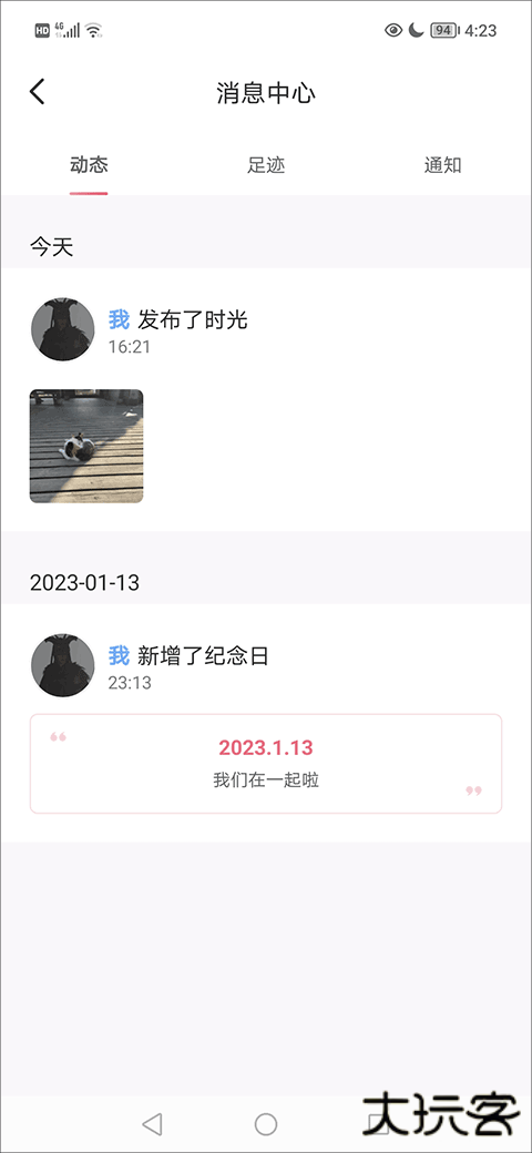 2、然后,在消息中心就能查看动态、足迹和通知了;