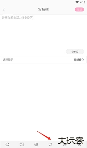 2、进入发帖页面,点击底端的“#”选项。