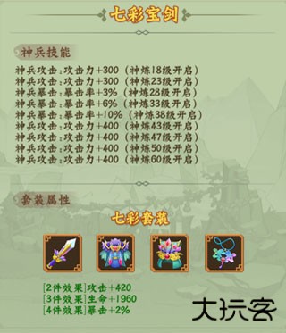 和紫色套装一样,金色套装也分为输出类和防御类,分别是山神套装和七彩套装,而且这两套的武器都是除了小蝴蝶和小金刚以外的最好的输出类角色和坦克类角色的缘分武器,建议获得后建议优先装备给所在阵容的主力以提升主力角色的能力。