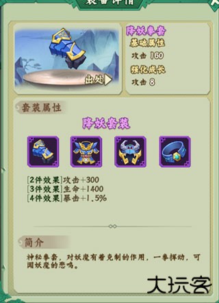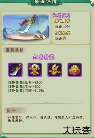 游戏内的紫色装备主要分为降妖套装和如意套装,分别对应游戏内的输出类角色和坦克类角色的装备,输出类角色推荐使用降妖套装,坦克类角色推荐使用如意套装,如意宝刀作为所有坦克类葫芦娃的缘分武器(小金刚除外),多使用并且强化可以更好地强化自身属性以及战力,降妖套装主要提升的则是输出,推荐给后排葫芦娃使用。