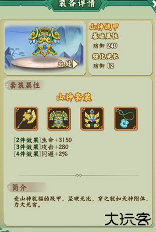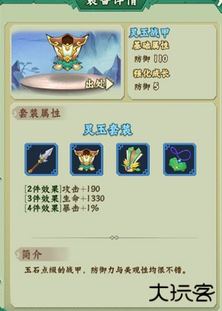 目前游戏蓝色装备只有灵玉套装,分为4件套,凑齐复数套装后会有相对应的套装属性,灵玉神作为攻击类武器而且与多数葫芦娃有着缘分效果加成,推荐作为前期过度所使用的主要攻击武器。