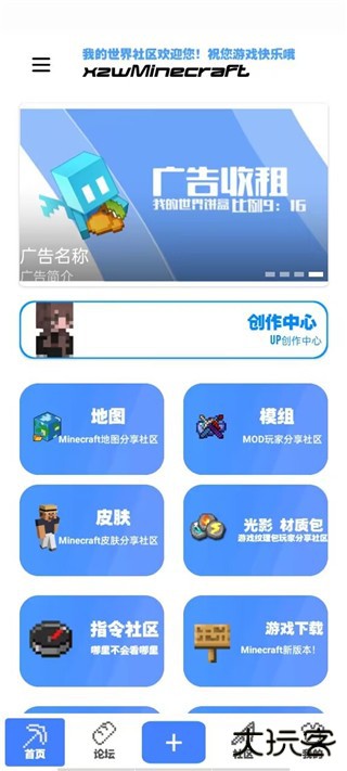 在app的首页中包含了游戏中的所有资源分享,例如地图、模组、皮肤、光影材质包、指令社区、游戏下载、音乐、种子社区、资源上传、遇事不决工具;