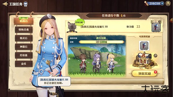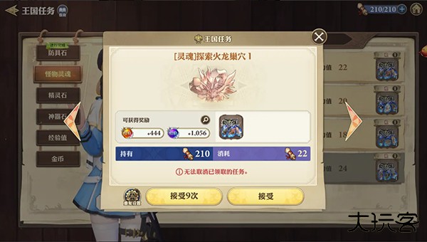 4、已接受的王国任务可在游戏画面的任务区域确认,需要注意的是,不能同时进行多个王国任务哦,完成王国任务时获得奖励,根据概率也可获得较大的奖励,设置了反复的话可自动再次进行当前任务。