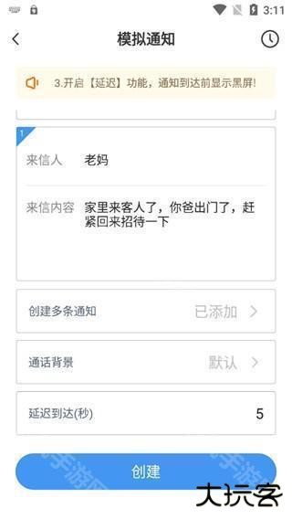 3、即可进入信息编辑板块,可以编辑来信人以及来信内容,以及多长时间收到短信,设置好之后点击创建