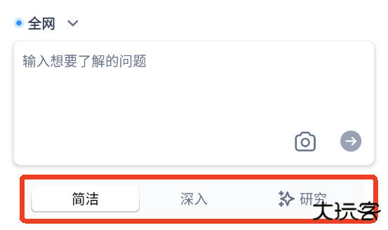 1、输入想要了解的问题,可以选择三种搜索模式,分别是简洁、深入和研究,还可以选择搜索范围,全网、文库、学术、图片和博客。