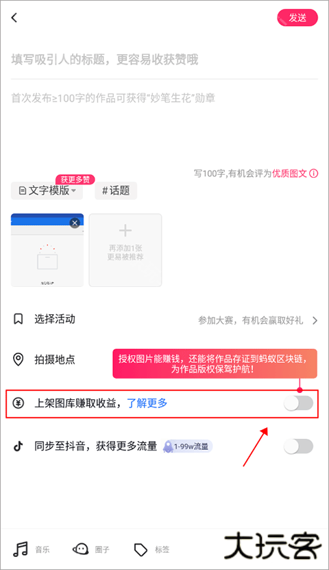 1、点击软件中央加号图标打开内容发布页面,在图片下方有一个【授权图库换收益】,只有将这个功能打开才能进行获取收益。