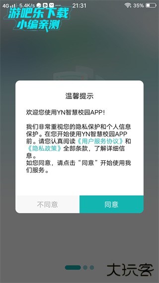 1、在手机端下载并安装YN智慧校园app,点击同意用户协议。